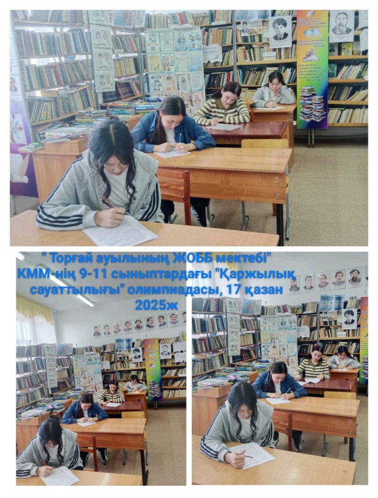 "Торғай ауылының жалпы орта білім беретін мектебі" КММ-сінде 17.10.2025 жылы "Қаржылық сауаттылық" олимпиадасы 9-11-ші сыныптар арасында өтті. Олимпиадаға қызығушылық танытып қатысқан оқушылар: Кайржанова Адина 11-сынып, Темирбекова Даяна 9-сынып, Құрмет Айсұлу 9-сынып,...